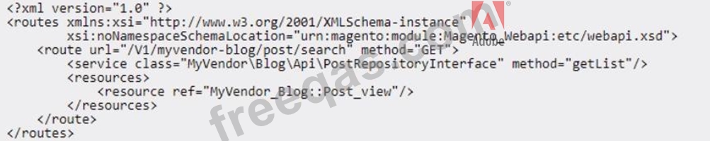 In Adobe Commerce, when defining new API endpoints through the webapi.xml configuration file, the visibility of these endpoints in tools likeSwagger(now OpenAPI) depends on several factors, including authentication settings. According to the provided webapi.xml file: <?xml version="1.0"?> <routes xmlns:xsi="http://www.w3.org/2001/XMLSchema-instance" xsi:noNamespaceSchemaLocation="urn:magento:module:Magento_Webapi:etc/webapi.xsd"> <route url="/V1/myvendor-blog/post/search" method="GET"> <service class="MyVendor\Blog\Api\PostRepositoryInterface" method="getList"/> <resources> <resource ref="MyVendor_Blog::Post_View"/> </resources> </route> </routes> * Option Asuggests moving the file to etc/webapi_rest/webapi.xml. However, this is incorrect because Adobe Commerce does not require separate XML files for REST and SOAP APIs in this context. The webapi.xml is used for defining routes for both. The structure and location provided in the question are correct for defining REST API routes. * Option Bis the correct answer. The resource reference MyVendor_Blog::Post_View indicates that this API endpoint is not anonymous; it requires authentication. In Adobe Commerce, if an API endpoint requires authentication, it won't be visible in Swagger (or the OpenAPI UI) unless you provide valid authentication credentials or tokens. This is part of Magento's security model where protected resources require tokens or OAuth to access. For the merchant to see this endpoint in Swagger, they must provide an integration token or OAuth token which has permissions for MyVendor_Blog::Post_View. This is detailed in the Adobe Commerce Developer Documentation under[Web API Authentication](https://x. com/i/grok?text=Web%20API%20Authentication). * Option Cmentions the @return annotation missing in the interface class. While proper annotations in PHPDoc are important for IDE autocompletion and documentation generation, they are not directly related to the visibility of an endpoint in Swagger. The visibility in Swagger is determined by the configuration in webapi.xml and the authentication settings, not by PHPDoc annotations. Thus, this option is incorrect in the context of the question. For further reading on how to manage and configure API endpoints in Adobe Commerce, including authentication, refer to the official Adobe Commerce Developer Guide: * Web API Configuration * Web API Authentication * Swagger Integrationfor testing and documenting APIs. This explanation covers the necessary aspects of Adobe Commerce API development, focusing on the configuration, authentication requirements, and how these affect the visibility of API endpoints in development tools like Swagger.