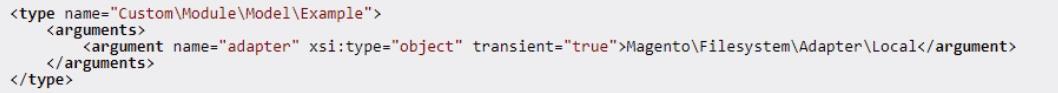 An Adobe Commerce developer is developing a custom module. As part of their implementation they have decided that all instances of their Custom\Module\Model\Example class should receive a new instance of Magento\Filesystem\Adapter\Local. How would the developer achieve this using di. xml?