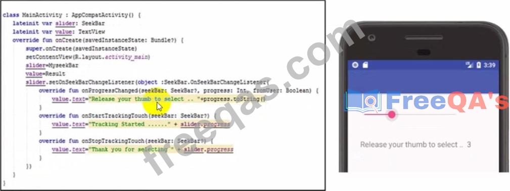The following images include an Android code for SeekBar (id: MyseekBar) and one state of its operation.