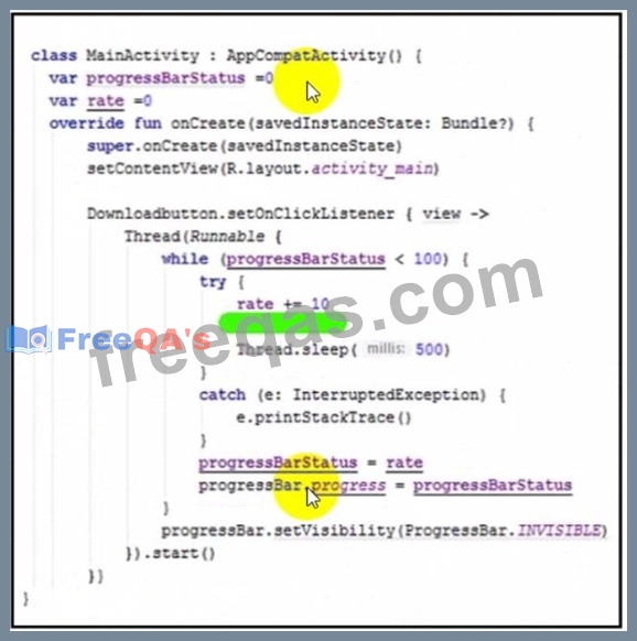 When the app user clicks this button, a progress bar with id: "progressBar" will show up. What will happen if you change *'rate+=10" illustrated with green underlined text to "rate+=50"?