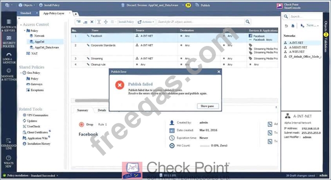 Administrator Kofi has just made some changes on his Management Server and then clicks on the Publish button in SmartConsole but then gets the error message shown in the screenshot below.