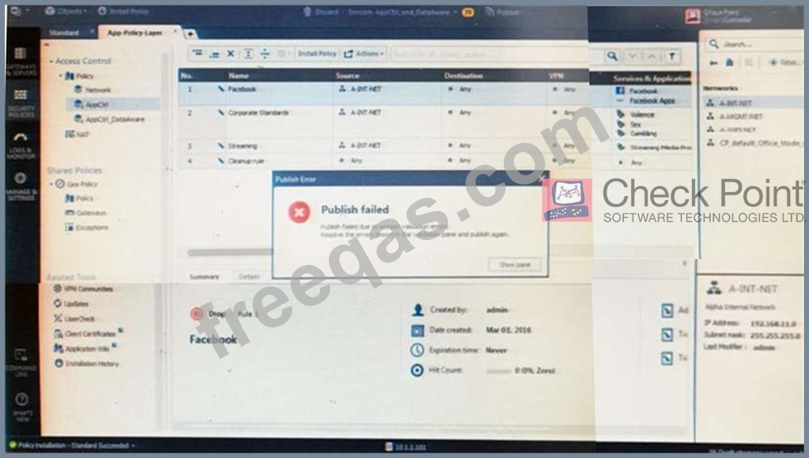 Administrator Kofi has just made some changes on his Management Server and then clicks on the Publish button in SmartConsole but then gets the error message shown in the screenshot below.