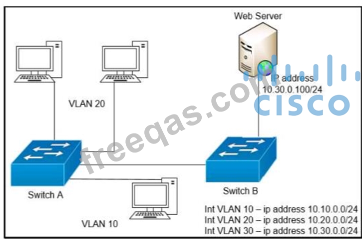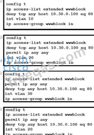 A network engineer must block access for all computers on VLAN 20 to the web server via HTTP All other computers must be able to access the web server Which configuration when applied to switch A accomplishes this task?
