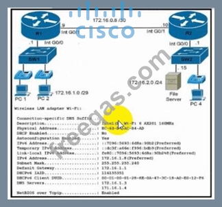 Refer to the exhibit. During initial configuration testing, the Windows workstation PC1 cannot connect with the 172.16.2.0/24 network.