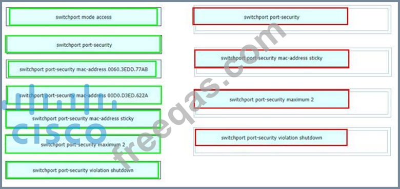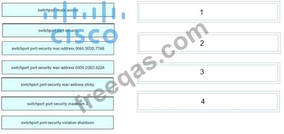 An engineer is tasked to configure a switch with port security to ensure devices that forward unicasts multicasts and broadcasts are unable to flood the port The port must be configured to permit only two random MAC addresses at a time Drag and drop the required configuration commands from the left onto the sequence on the right Not all commands are used.
