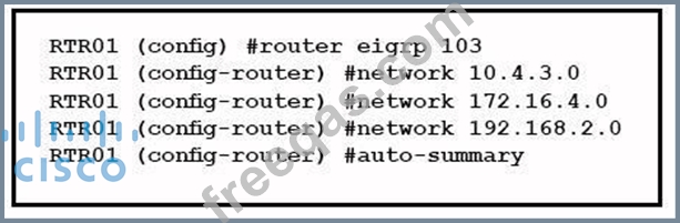 Refer to the exhibit. If RTR01 is configured as shown, which three addresses will be received by other routers that are running EIGRP on the network? (Choose three)