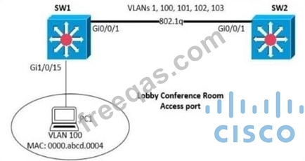 SW1 supports connectivity for a lobby conference room and must be secured. The engineer must limit the connectivity from PC1 to the SW1 and SW2 network.