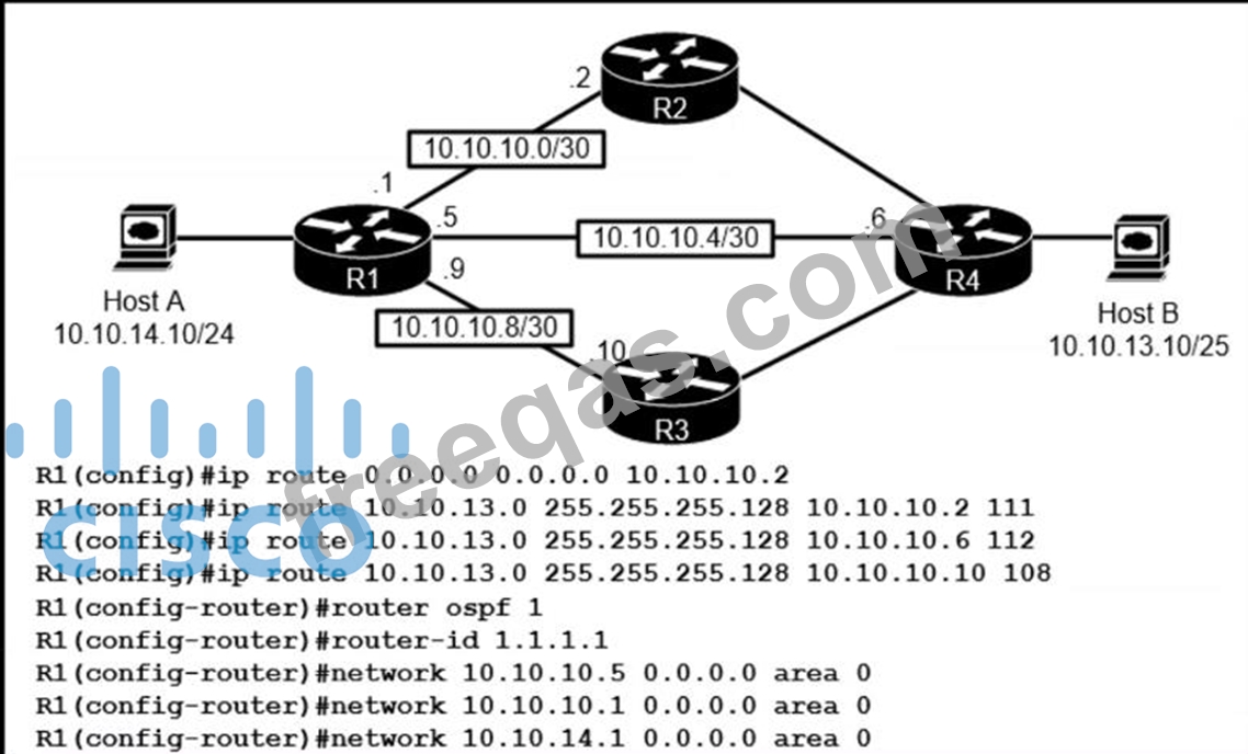 R1 has just received a packet from host A that is destined to host B. Which route in the routing table is used by R1 to reac B?