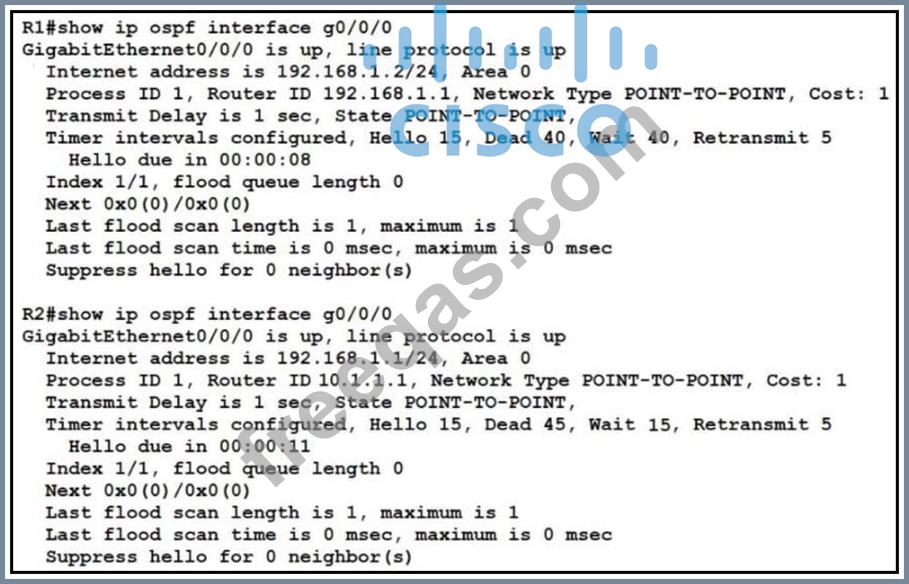 Refer to the exhibit. The network engineer is configuring router R2 as a replacement router on the network. After the initial configuration is applied, it is determined that R2 failed to show R1 as a neighbor. Which configuration must be applied to R2 to complete the OSPF configuration and enable it to establish the neighbor relationship with R1?