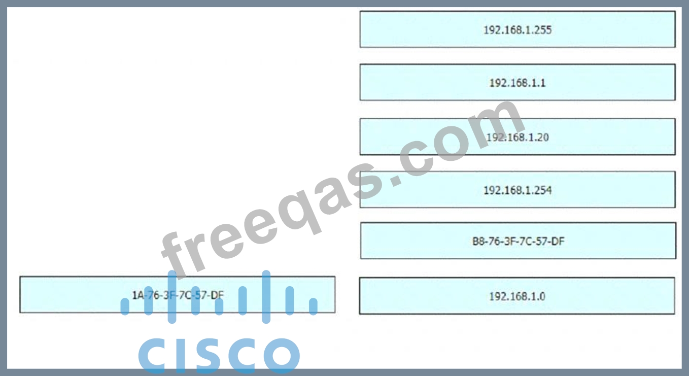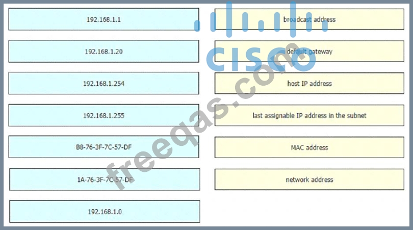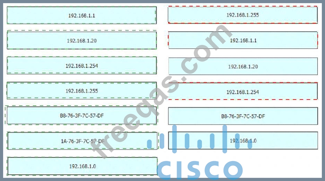 An engineer is required to verify that the network parameters are valid for the users wireless LAN connectivity on a /24 subnet. Drag and drop the values from the left onto the network parameters on the right. Not all values are used.