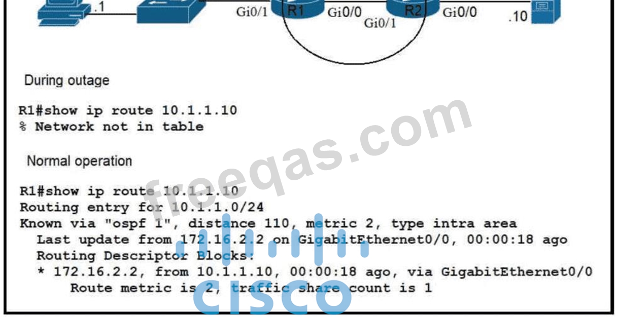Which route must be configured on R1 so that OSPF routing is used when OSPF is up. but the server is still reachable when OSPF goes down?