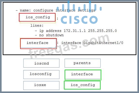 Drag and drop the code from the bottom onto the box where the code is missing in the Ansible playbook to apply the configuration to an interface on a Cisco IOS XE device. Not all options are used.