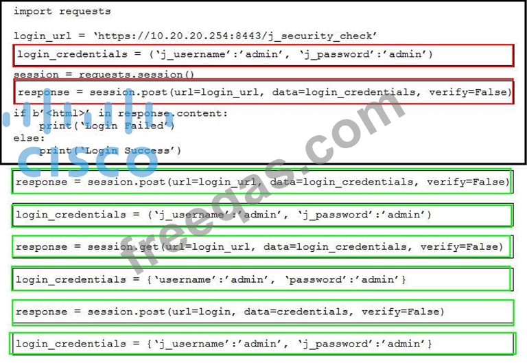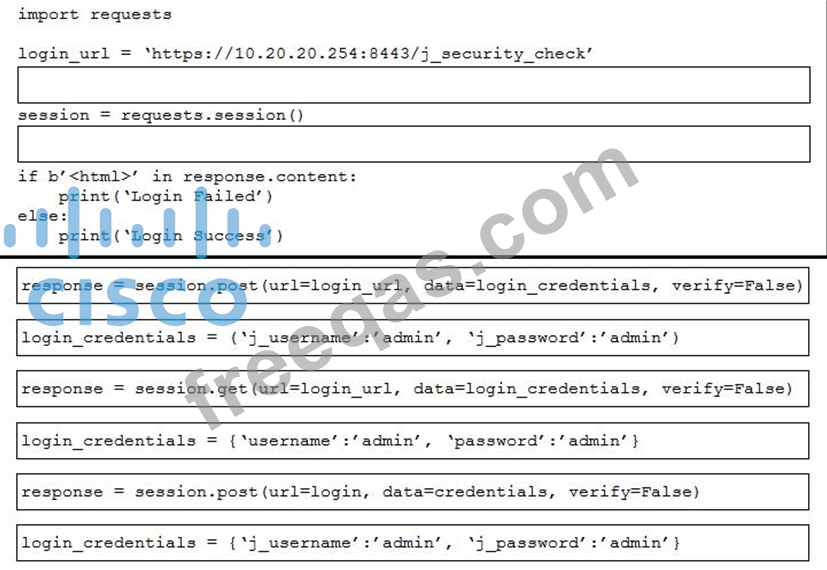 Drag and drop the code from the bottom onto the box where the code is missing to perform the login operation and security check on the vManage web server at the specified IP address. Not all code options are used.