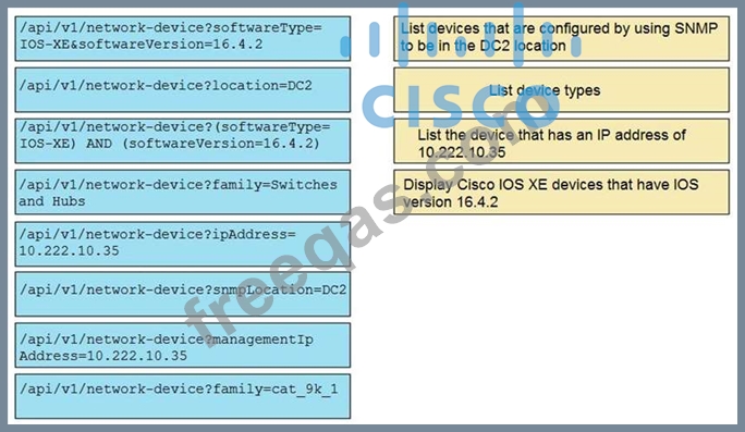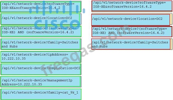 Refer to the exhibit. A GET request is issued to the Cisco DNA Center REST API. Drag and drop the GET request URL subpaths from the left onto the objectives on the right. Not all options are used.