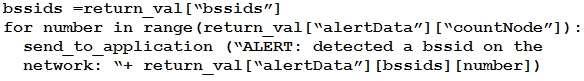 Refer to the exhibit. The goal is to write a Python script to automatically send a message to an external messaging application when a rogue AP is detected on the network. The message should include the broadcast SSID that is in the alert. A function called "send_to_application" is created, and this is the declaration: