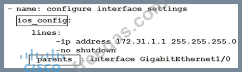 Drag and drop the commands to the Ansible playbook that applies configuration to an interface on a Cisco IOS XE device. Not all options are used.