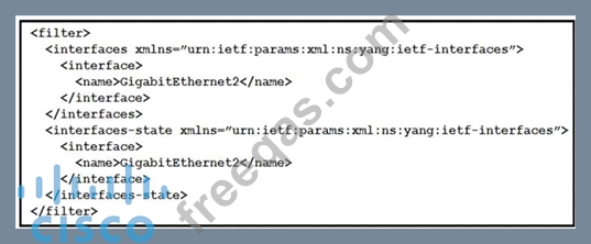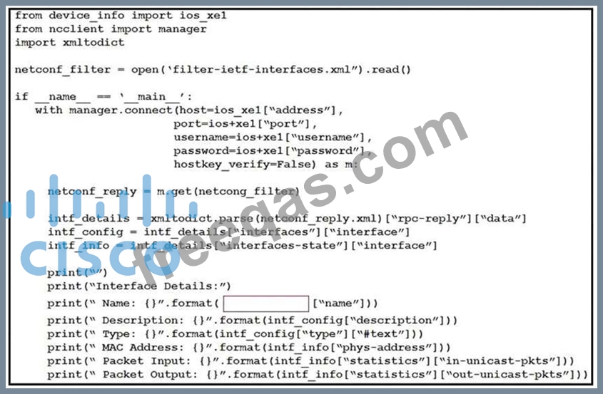 An engineer creates a Python scripts using ncclient to display interface information. The code must be completed so that it can be tested. Which expression completes the highlighted section in the format call?
