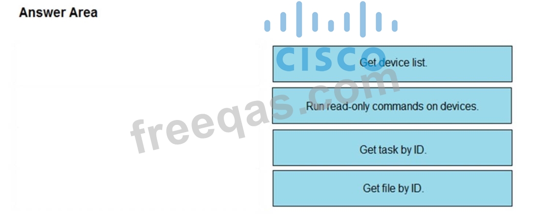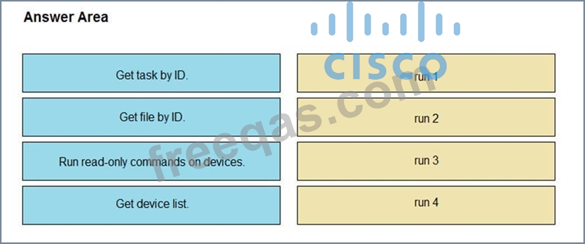A Cisco DNA Center script must be written to retrieve a list of interfaces on a switch. Drag and drop the API calls that are needed to return the list of interfaces using the Command Running APIs from the left into the correct sequence on the right.