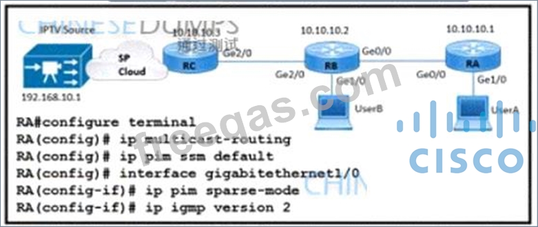 The UserA device fails to recede IPTV streaming traffic from the source While debugging the issue a network engineer finds that routers RB and RC receive the multicast traffic normally RC receives subscription messages from UserA to join the IPTV stream Which action must the engineer lake on router RA to correct this problem?