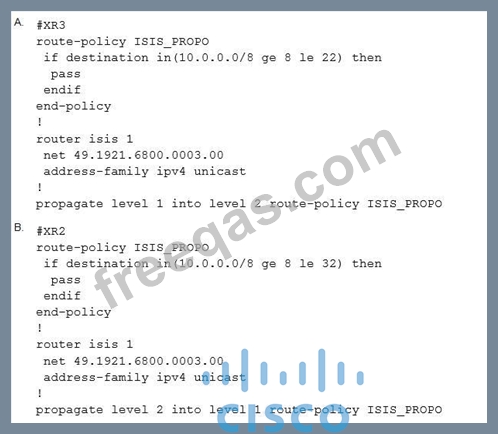 A network operator must inject a Level 1 route from XR2 (10.16.16.0/24) into the ISIS topology. Which configuration allows the injection in a way that XR3 and XR1 have a valid and working route for 10.16.16.0/24?