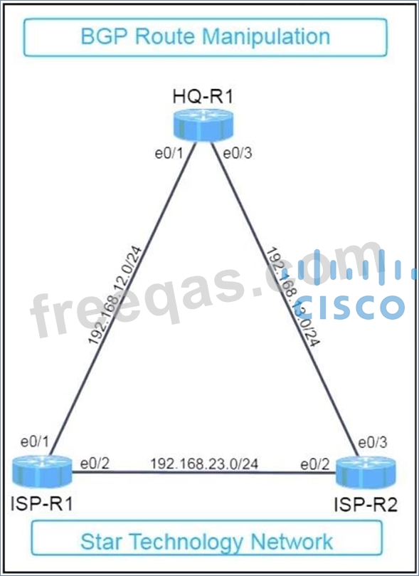 Based on network design, an autonomous system of Star Technology is 1, and AS of ISP is 2. A network Implementation Engineer has already initiated the configuration; trouble-shooting is required to find out and complete missing configurations. Moreover, configuration is to be established in a way that links between HQ-R1 and ISP-R1 can be used as the preferred path for reaching AS 2.