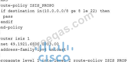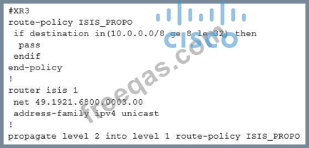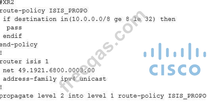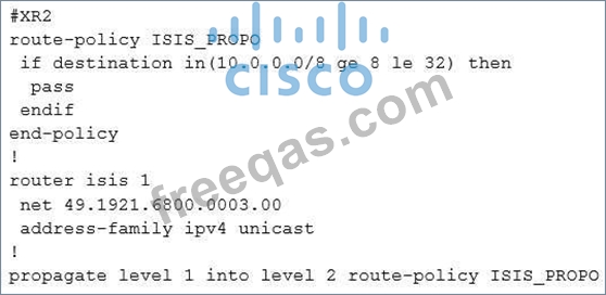 Refer to the exhibit. A network operator must inject a Level 1 route from XR2 (10.16.16.0/24) into the ISIS topology. Which configuration allows the injection in a way that XR3 and XR1 have a valid and working route for 10.16.16.0/24?