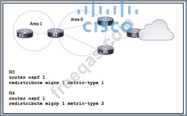 Routers R1, R2. R3, and R4 have been configured to run OSPF. and router R5 is running EIGRP Traffic from R1 to R5 is expected to pass via R4. but OSPF routing has calculated the best path via R3. Which action corrects the problem?