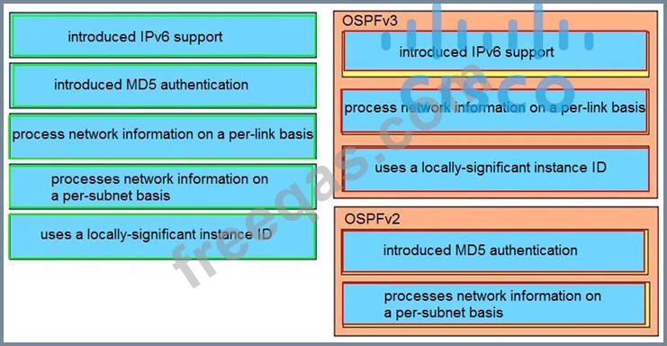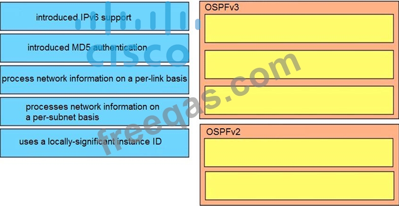 Compare different features between OSPFv2 and OSPFv3. Drag and drop the descriptions of OSPF from the left onto the correct OSPF versions on the right.