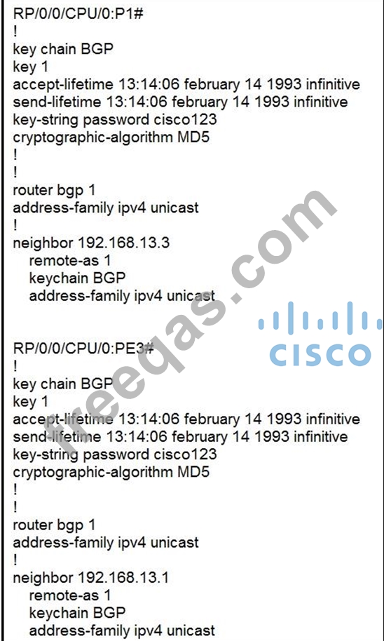 P1 and PE3 Cisco IOS XR routers are directly connected and have this configuration applied. The BGP session is not coming up. Assume that there is no IP reachability problem and both routers can open tcp port 179 to each other. Which two actions fix the issue? (Choose two.)