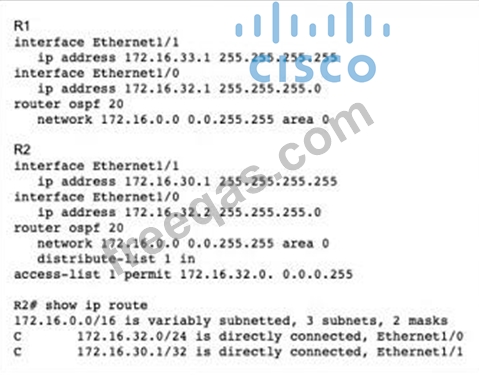 A network engineer notices that router R2 is failing to install network 172.16.33.1/32 in the routing table. Which configuration must the engineer apply to R2 to fix the problem?