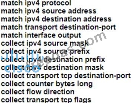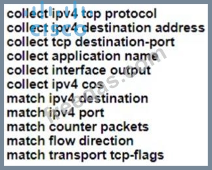 A network engineer must collect traffic statistics for an internal LAN toward the internet. The sample must include the source and destination IP addresses the destination ports, the total number of bytes from each flow using a 64-bit counter and all transport flag information. Because of CPU limits, the flow collector processes samples that are a maximum of 20 seconds long.