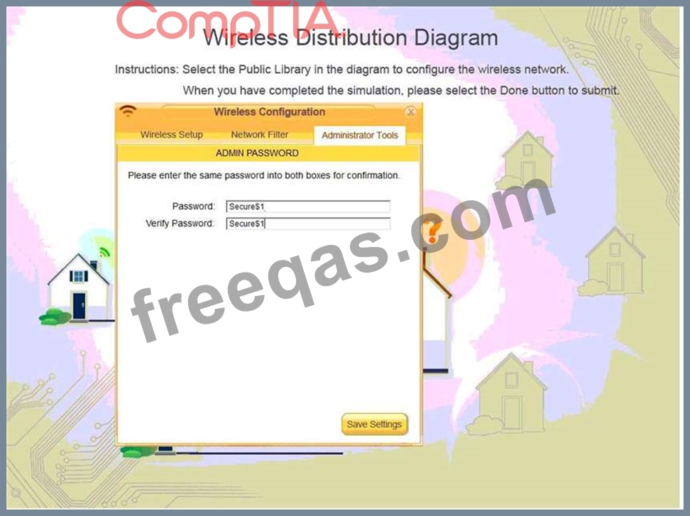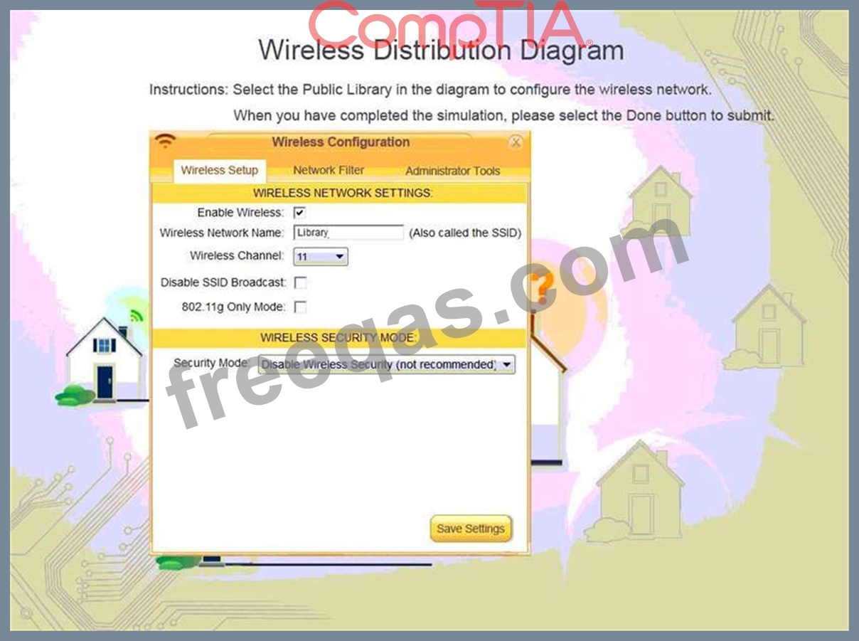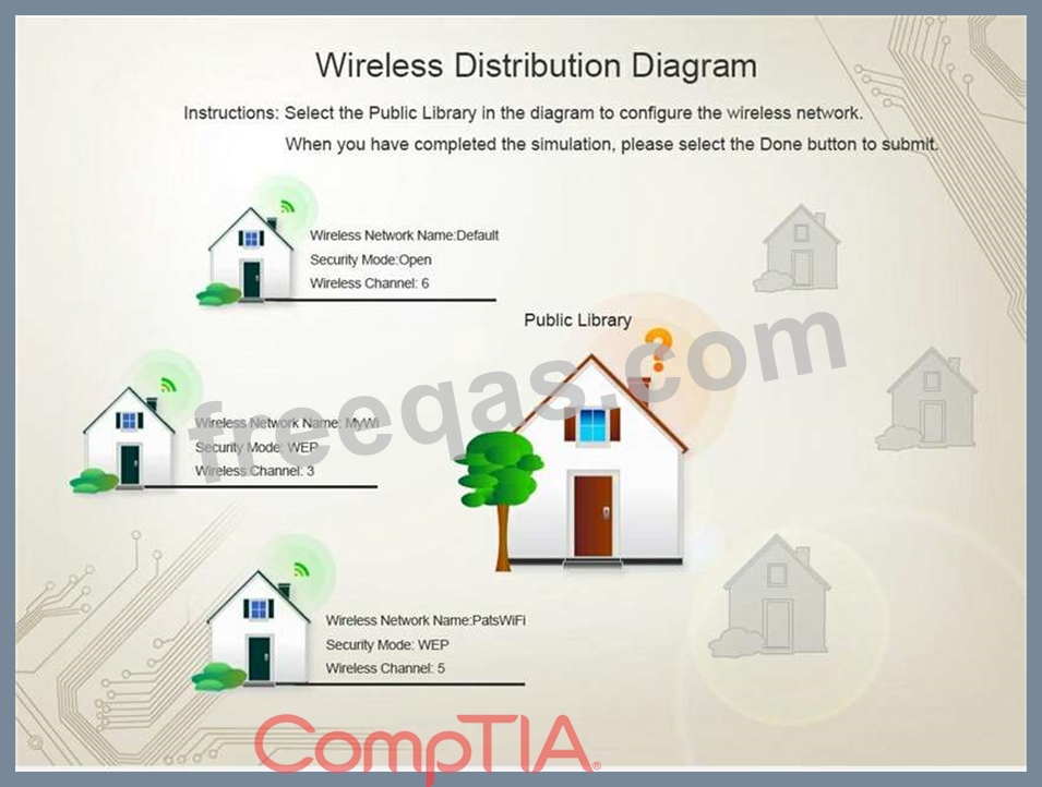 Instructions: Select the Public Library in the diagram to configure the wireless network. Once the wireless network tabs are configured, select the save button. When you have completed the simulation, please, select the Done button to submit.