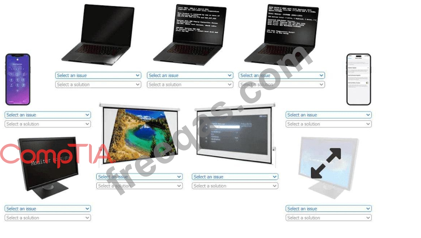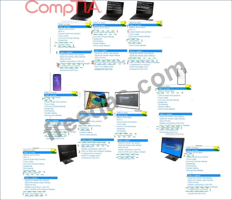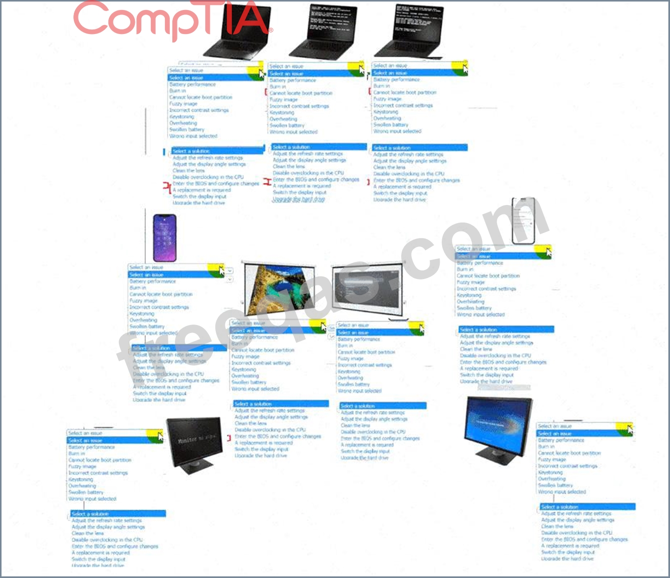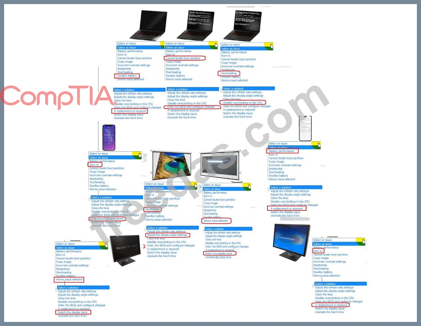 Click on each device to review the issue. Then select the appropriate issue and solution from the drop-down menu. Each option may be used more than once.