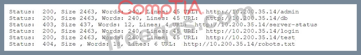 A penetration tester fuzzes an internal server looking for hidden services and applications and obtains the following output: