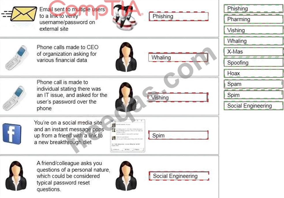 D: SPIM is a term sometimes used to refer to spam over IM (Instant Messaging). It's also called just spam, instant spam, or IM marketing. No matter what the name, it consists of unwanted messages transmitted through some form of instant messaging service, which can include Short Message Service (SMS) E: Social engineering is a non-technical method of intrusion hackers use that relies heavily on human interaction and often involves tricking people into breaking normal security procedures. It is one of the greatest threats that organizations today encounter. A social engineer runs what used to be called a "con game." For example, a person using social engineering to break into a computer network might try to gain the confidence of an authorized user and get them to reveal information that compromises the network's security.