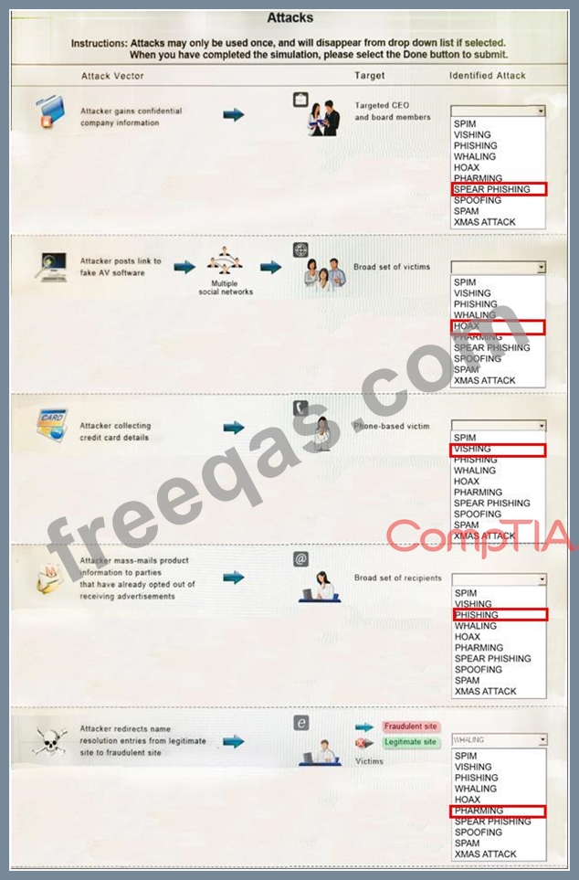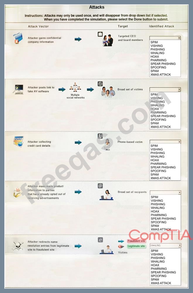 Select the appropriate attack from each drop down list to label the corresponding illustrated attack.