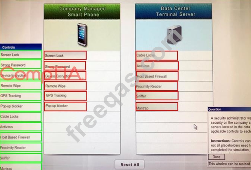 A security administrator wants to implement strong security on the company smart phones and terminal servers located in the data center. Drag and drop the applicable controls to each asset types?