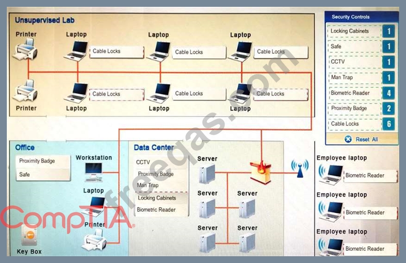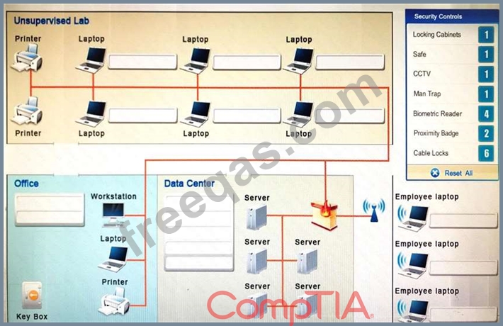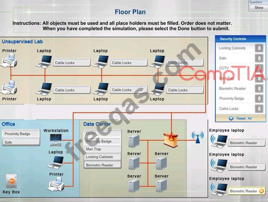 You have been tasked with designing a security plan for your company. Drag and drop the appropriate security controls on the floor plan.