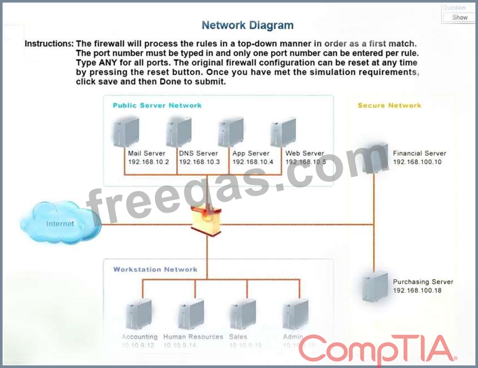 Instructions: The firewall will process the rules in a top-down manner in order as a first match The port number must be typed in and only one port number can be entered per rule Type ANY for all ports. The original firewall configuration can be reset at any time by pressing the reset button. Once you have met the simulation requirements, click save and then Done to submit.