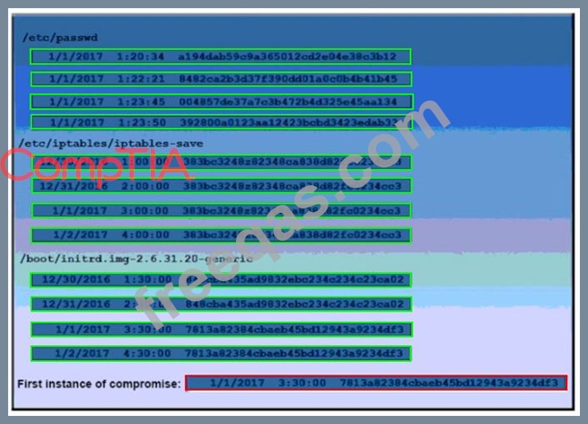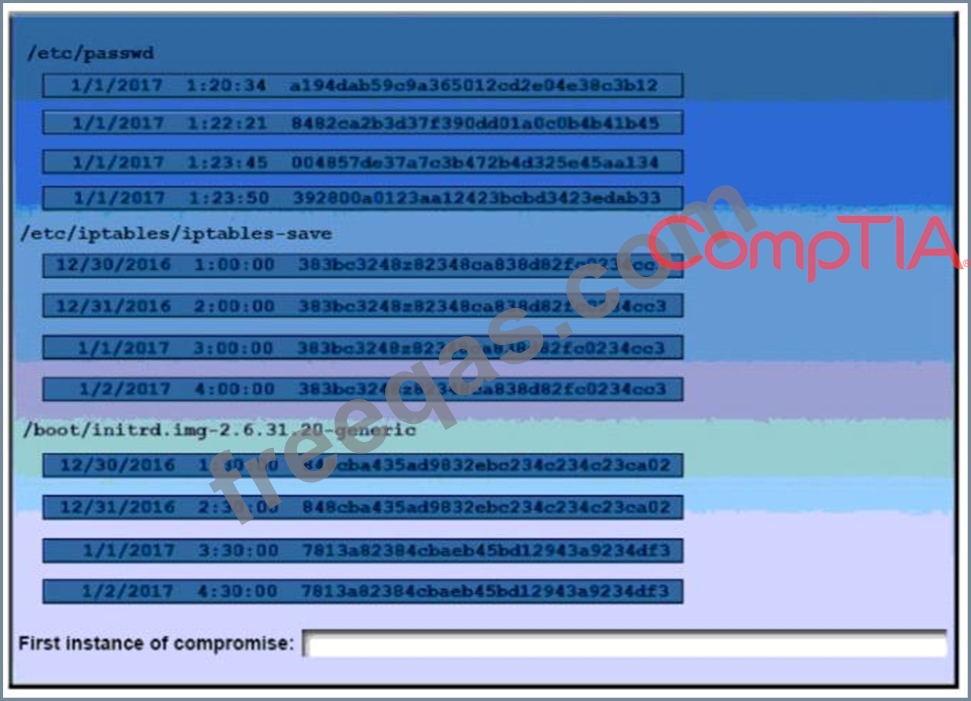 A security auditor is reviewing the following output from file integrity monitoring software installed on a very busy server at a large service provider. The server has not been updates since it was installed. Drag and drop the log entry that identifies the first instance of server compromise.