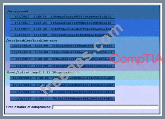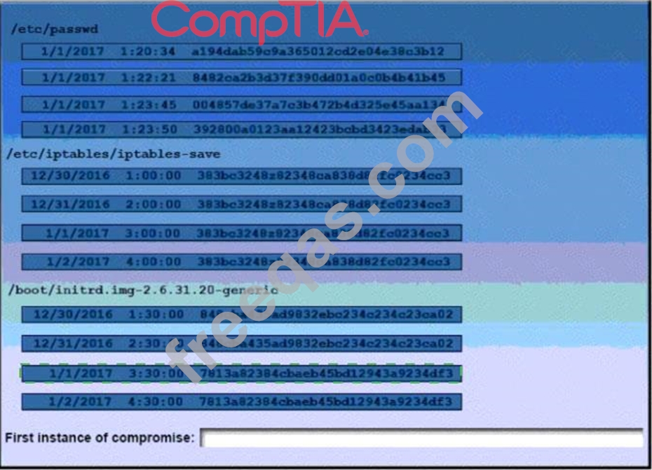 A security auditor is reviewing the following output from file integrity monitoring software installed on a very busy server at a large service provider. The server has not been updates since it was installed. Drag and drop the log entry that identifies the first instance of server compromise.