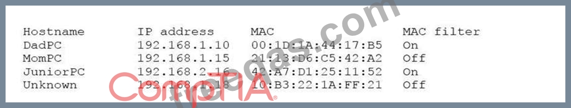 A user suspects someone has been accessing a home network without permission by spoofing the MAC address of an authorized system. While attempting to determine if an authorized user is logged into the home network, the user reviews the wireless router, which shows the following table for systems that are currently on the home network.