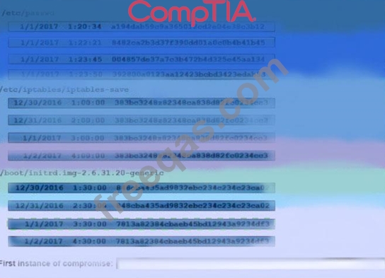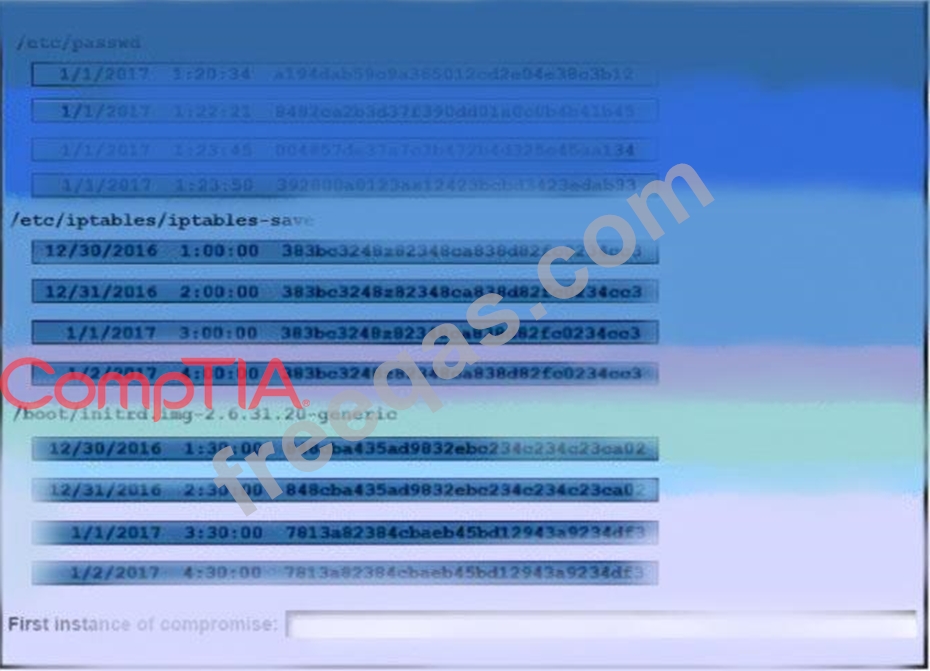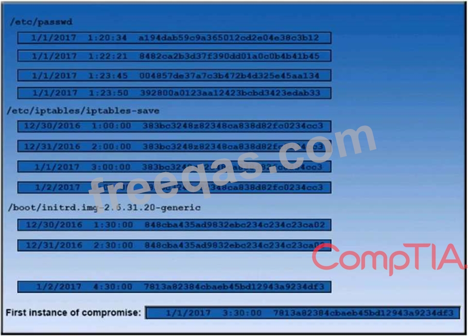 A security auditor is reviewing the following output from file integrity monitoring software installed on a very busy server at a large service provider. The server has not been updates since it was installed. Drag and drop the log entry that identifies the first instance of server compromise.