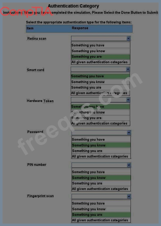 For each of the given items, select the appropriate authentication category from the dropdown choices.