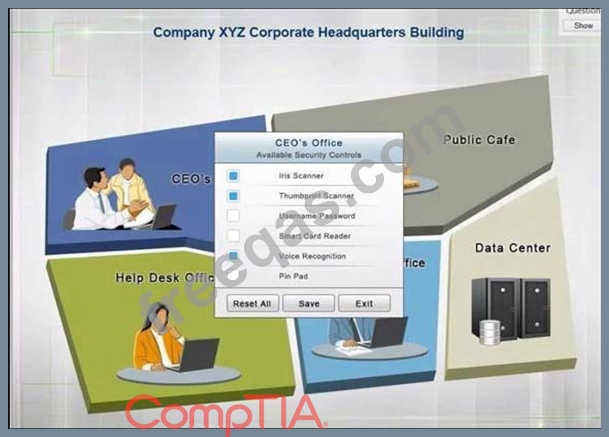 Instructions: The original security controls for each office can be reset at any time by selecting the Reset button. Once you have met the above requirements for each office, select the Save button. When you have completed the entire simulation, please select the Done button to submit. Once the simulation is submitted, please select the Next button to continue.