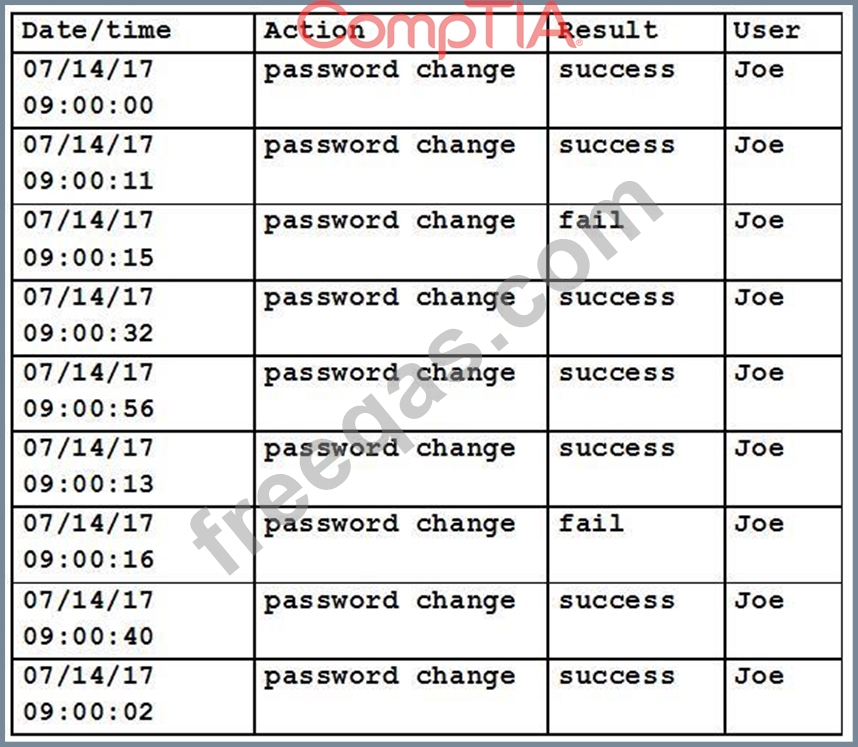Upon learning about a user who has reused the same password for the past several years, a security specialist reviews the logs. The following is an extraction of the report after the most recent password change requirement: