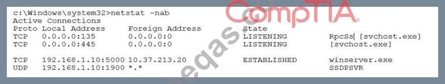 After a user reports slow computer performance, a system administrator detects a suspicious file, which was installed as part of a freeware software package. The systems administrator reviews the output below: