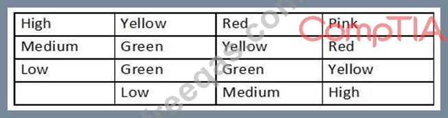 An analyst generates the following color-coded table shown in the exhibit to help explain the risk of potential incidents in the company. The vertical axis indicates the likelihood of an incident, while the horizontal axis indicates the impact.
