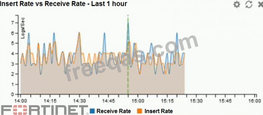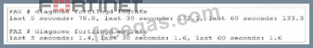 In this output, we see two diagnostic commands executed on a FortiAnalyzer device: * diagnose fortilogd lograte: This command shows the rate at which logs are being processed by the FortiAnalyzer in terms of log entries per second. * diagnose fortilogd msgrate: This command displays the message rate, or the rate at which individual messages are being processed. The values provided in the exhibit output show: * Log rate (lograte): Consistently high, showing values such as 70.0, 132.1, and 133.3 logs per second over different time intervals. * Message rate (msgrate): Lower values, around 1.4 to 1.6 messages per second. Explanation: * Interpretation of log rate vs. message rate: In FortiAnalyzer, the log rate typically refers to the rate of logs being stored or indexed, while the message rate refers to individual messages within these logs. Given that a single log entry can contain multiple messages, it's common to see a lower message rate relative to the log rate. * Understanding normal operation: In this case, the message rate being lower than the log rate is expected and typical behavior. This discrepancy can arise because each log entry may bundle multiple related messages, reducing the message rate relative to the log rate. Conclusion * Correct answer: A. The message rate being lower than the log rate is normal. * This aligns with the normal operational behavior of FortiAnalyzer in processing logs and messages. There is no indication that both logs and messages are nearly finished indexing, as that would typically show diminishing rates toward zero, which is not the case here. Additionally, there's no information in this output about specific ADOMs or a comparison between traffic logs and event logs. Thus, options B, C, and D are incorrect. References: FortiOS 7.4.1 and FortiAnalyzer 7.4.1 command guides for diagnose fortilogd lograte and diagnose fortilogd msgrate.