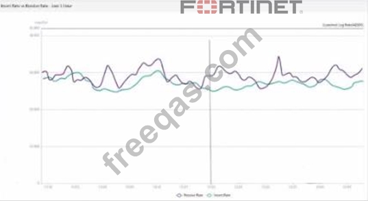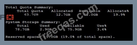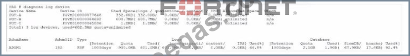 The exhibit displays a diagnose log device output on a FortiAnalyzer, showing details about disk space usage and quotas for different FortiGate devices and ADOMs (Administrative Domains). Here's a breakdown of key details: * Disk Quota for Quarantined Files: * The output includes columns labeled for used space in categories such as "logs," "quarantine," "content," and "DB." For each device, the quarantine column consistently shows 0.0KB used, indicating that there is no disk quota allocated or utilized for quarantining files. * Conclusion:Correct. * FGT_B as Security Fabric Root: * There is no direct indication from this output that specifies FGT_B is the root of the Security Fabric. Information on Security Fabric topology or root designation would typically come from a Security Fabric configuration command rather than a disk usage summary. * Conclusion:Incorrect. * Allocated Disk Quota for ADOM1: * The output shows the quota for ADOM1 is "unlimited," not a fixed 3 GB quota. Therefore, there is no set 3 GB limit for ADOM1. * Conclusion:Incorrect. * Comparison of Archive Logs and Analytic Logs: * The output does not differentiate between archive logs and analytic logs; it only shows overall disk usage by type (e.g., logs, quarantine). Therefore, no conclusion can be made about which type of logs (archive or analytic) is using more space. * Conclusion:Incorrect. Conclusion: * Correct Answer:A. There is no disk quota allocated to quarantining files. * This answer aligns with the observed data, where no disk space is used or allocated for quarantine files. References: * FortiAnalyzer 7.4.1 documentation on diagnose log device command usage and disk quota settings.